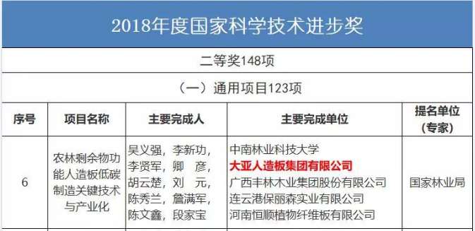 大亚人造板集团作为第二完成单位,与中南林业科技大学、广西丰林木业集团股份有限公司、连云港保丽森实业有限公司、河南恒顺植物纤维板有限公司共同完成该项目。针对人造板易燃烧、防潮性能差、释放甲醛以及生产效率低、能耗高等技术难题,项目研发了农林剩余物功能人造板绿色胶黏剂及其高效制备、多元体系坯料分级节能快构、高效节能成形技术及核心装备,构建了农林剩余物功能人造板低碳制造技术体系,为我国人造板产业结构优化升级及行业技术进步提供了重大技术支撑,对保障木材安全、生态安全,实现林产工业绿色可持续发展具有重要意义。
